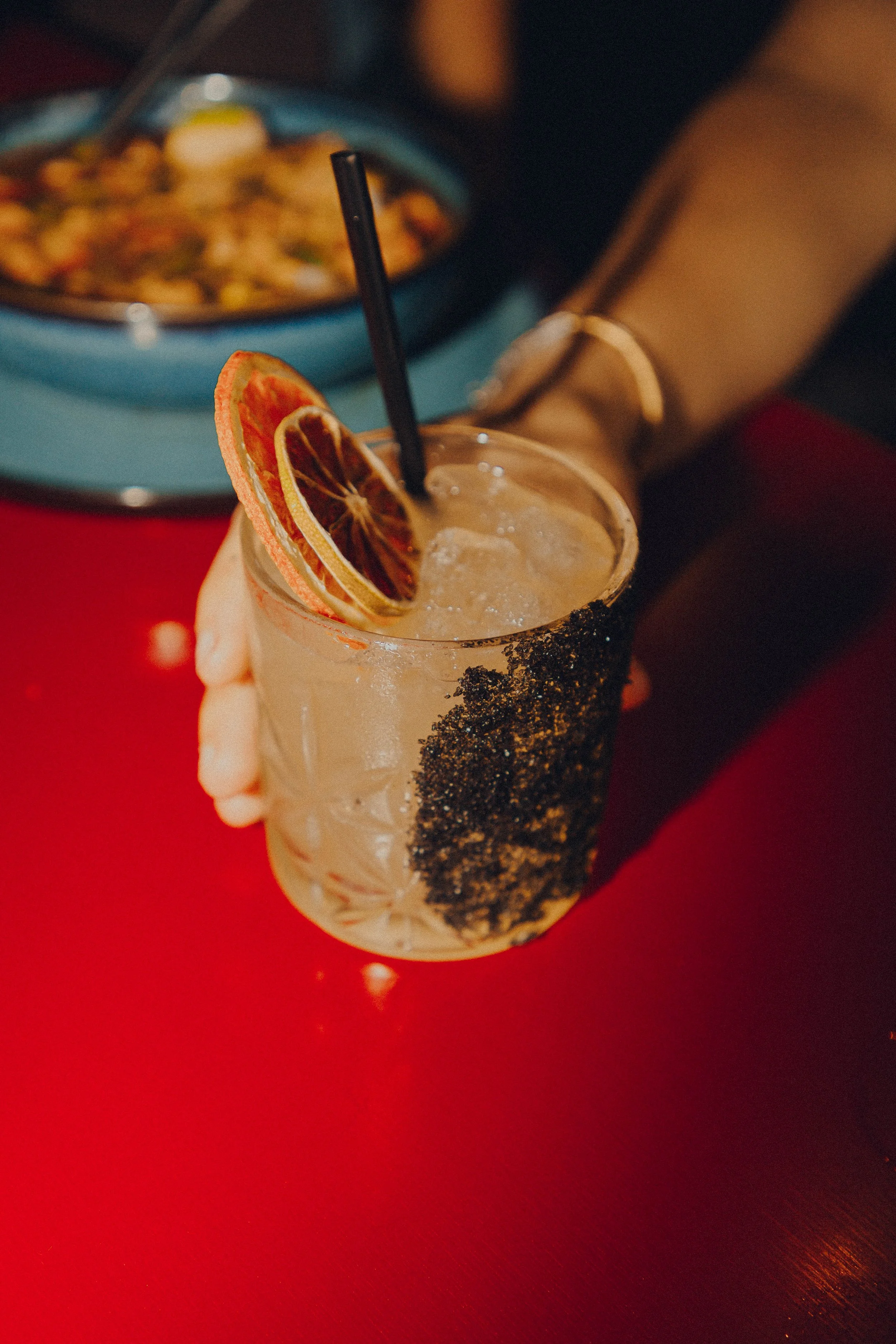 A refreshing embrance. Tequila blanco, pressed cucumber, fresh lemon, agave nectar, muddled min, and tajin.